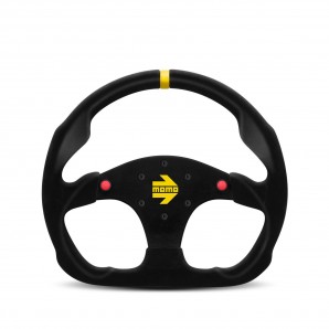 The MOMO MOD.30 is a racing steering wheel designed for use in GT and saloon cars. The flat bottom allows for easier access into the cockpit and a yellow leather marker at the top to provide the driver with a quick reference to the steering position. Finished in black suede, the steering wheel features black aluminium spokes, an anatomical grip for increased comfort, two red push buttons and the yellow MOMO logo in the centre. All MOMO racing steering wheels are produced in Italy to the highest quality with anticorodal aluminium frames. The suede or leather covering is glued to the rim, instead of being stitched, to provide a seamless finish for greater comfort and durability