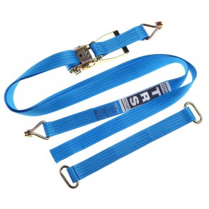 The TRS Heavy Duty Choker End Ratchet Tie Down is a two part assembly with a 2000kg rated break force. It features a double locking handle ratchet, choker eyelet end fittings and is produced using blue 50mm width high tenacity polyester webbing.