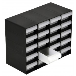 he B-G Storage Cabinets can be used as free-standing units or attached to the wall with the keyhole mounting points on the rear face - making these versatile organiser units. This cabinet features 20 equal sized drawers which each measure 105mm x 59mm x 35mm.